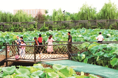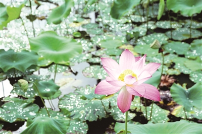 只在高台上看荷花,显然不过瘾。我走下高台,步入玻璃栈道,近距离观赏起荷花来。说是来休闲的,其实都在忙着,最忙的莫过于眼睛,看这一朵,很美;再看那一朵,似乎也美;再看另一朵,好像更美,两只眼睛根本忙不过来。于是,相机和手机成了眼睛的“助手”,远景,近景,特写,统统不肯放过,只听得快门声此起彼落,不绝于耳。因为来得早,露珠还未来得及隐身,珠圆玉润,晶莹剔透,在荷叶上滚来滚去,有的站立不稳,一不小心便跌入下一层荷叶的怀抱;有的干脆跳入塘中,荡起一圈圈柔波后躲起了迷藏。荷花错落有致,仪态万方,有的迎风怒放,炫耀着自己的美色;有的含苞未放,在微风中扭动着苗条的身姿;有的花儿已然凋谢,只留下黄色的莲蓬和一圈细密的“胡须”。一些荷叶平铺在水面上,成了青蛙们的“运动场”和“遮阳伞”;还有一些荷叶刚刚露出水面不久,叶片卷曲,叶尖朝天,蜻蜓停歇在叶尖之上,重复着古老的诗情。荷塘里的蜻蜓很多,红的,绿的,大的,小的,不知疲倦地上下翻飞,翩翩起舞,像为荷花仙子伴舞,又像与众多游人同乐。