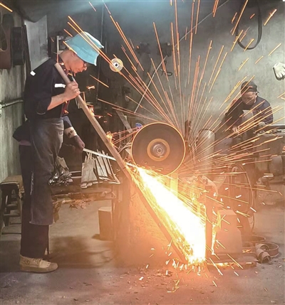 转到车间一侧,只见一位工人师傅正在电动砂轮上打磨宝剑,一道道星火之光从砂轮上飞出,很是耀眼夺目。