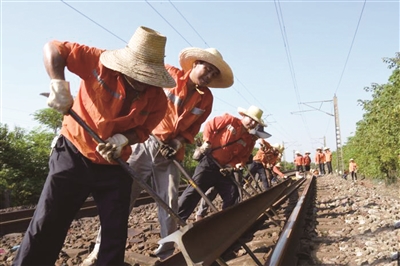 连日来,江西赣北地区气温直线攀升。京九铁路是连接中国南北的主要繁忙干线。由于运量大,钢轨磨耗较快,容易发生钢轨伤损病害。近日,南铁九江桥工段德安线路车间20余名职工顶着烈日,冒着36℃高温天气更换京九铁路庐山至德安区段伤损钢轨。为了降低对列车运行的影响,换轨施工须在150分钟内完成,时间紧、任务重,铁路工人不畏酷暑争分夺秒,顺利完成了更换伤损钢轨施工任务。