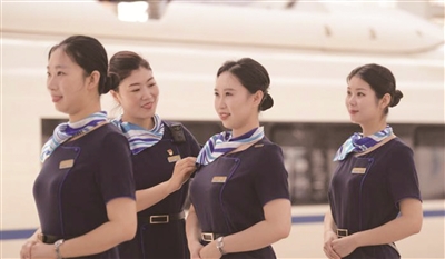 暑运期间,“动姐”们的工作节奏明显更快。为确保服务质量,在长春客运段,在接车之前,“动姐”们会在站台内进行基础礼仪、职业形象、服务技巧等内容的训练。图为在长春站,长春客运段的“动姐”进行职业形象整理。