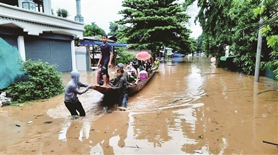 7月28日,救援人员在缅甸克伦邦渺瓦底转移受灾群众。由于近日持续遭遇强降雨,缅甸部分地区发生洪灾。新华社发