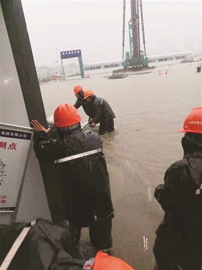 20日下午,项目部二里岗站场内门口积水达50厘米左右,西侧紫荆山路的积水也越来越深。项目部组织现场人员有序撤离基坑到达安全地带,对施工现场的安全防护措施、配电箱、防汛物资储备情况进行排查。不间断抽排基坑积水,进行基坑监测。协助地铁运营公司对二里岗地铁站D口树立防汛挡板。同时,在确保人员安全的情况下,对道路两侧下水道井盖、隔离护栏进行细致排查,有组织地在深水中帮助被困居民脱险。