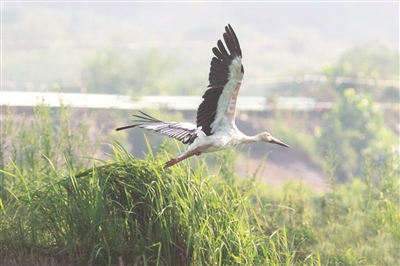 眼下,正值盛夏时节,两只国家一级保护动物——东方白鹳在江西省瑞昌市赤湖湿地嬉戏、觅食。据九江市野保专家介绍,东方白鹳属大型涉禽,体态优美,是国家一级重点保护动物,一般秋、冬季在长江中下游湿地湖泊越冬。此次夏季在瑞昌赤湖湿地观测到它们,在整个九江地区尚属首次。珍稀鸟类成为留鸟在此栖息,充分说明了九江的生态环境持续向好,赤湖水质优良。图为国家一级保护动物——东方白鹳在江西省瑞昌市赤湖湿地上翱翔。