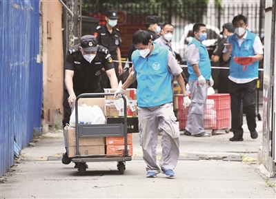 8月3日,在国兴家园小区北门,志愿者(前右)与安保人员(前左)运送小区居民订购的物品。8月2日,北京新增1例京外关联本地新冠肺炎确诊病例,为7月29日公布确诊病例的密切接触者,其住址为北京市海淀区首体南路20号国兴家园。目前,国兴家园小区已封闭管理。小区所在的甘家口街道安排社区工作人员、志愿者,通过递送小区居民订购物品、回收生活垃圾、询问居家老人生活状况等方式,保障小区内居民的日常生活。