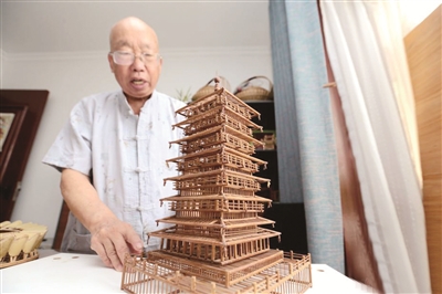 今年78岁的经金山,是陕西省非物质文化遗产民间竹扎技艺第三代传承人,自幼师从父亲学习竹扎、木工技艺。家中摆满了钟鼓楼、陕西八大怪、长安塔等精致的竹扎作品,皆为榫卯结构。经金山希望用自己的方式,将历史用竹扎记录下来。图为经金山展示长安塔竹扎模型。