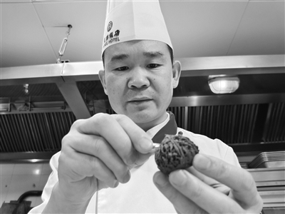 可以干自己喜欢的事情,对于赵会连来说是件快乐的事情。作为一位初学者,他暗下决心:加班加点学习技艺。师傅制作时,他全神贯注,脑子里飞快的记忆着每个步骤。“师傅很耐心,但是学徒这么多,师傅不可能手把手教每一个徒弟。要想学得快,没有其他的方法,就是要自己多练。”赵会连说。那段时间,下班后的赵会连没有离开厨房,一个人留下边回忆白天师傅的制作要点,边动手重新制作、练习。