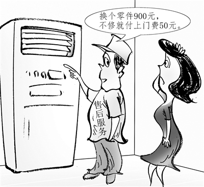 近日,消费者杜女士向记者反映,家中某品牌空调在开机不久后停止工作并一直处于“H5”故障状态。她随即联系该品牌客服,对方承诺次日会准时派人上门检查维修。但维修人员比约定时间迟到两小时。“上门全程不到5分钟,没对空调做任何检查,只听我说‘显示H5’便要求更换一个900多元的零件。我拒绝后,他便要离开,并让我支付50元上门费。”杜女士认为,该品牌是国内知名品牌,在售后服务方面应保证相应的质量。(8月17日《工人日报》) □陶小莫