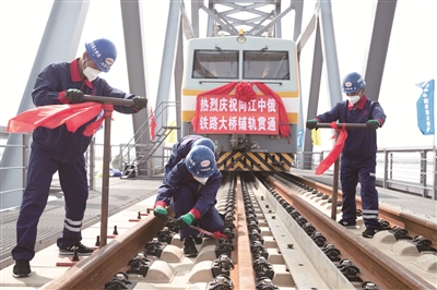 新华社电 8月17日上午,在同江中俄黑龙江铁路大桥施工现场,中俄两国准轨接口最后一组轨道夹板安装完成,标志着中俄两国首座跨江铁路大桥——同江中俄黑龙江铁路大桥实现铺轨贯通,为大桥全线开通运营奠定了坚实基础。