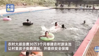 湖南道县,50岁大叔杨景易,因担心村里孩子玩耍时发生溺水,自费30多万,花了3个月时间在家乡修建了一个农村游泳池,并分了深水区和浅水区,让村里孩子们免费游玩。杨大叔也会在一旁指导游泳技能,为孩子们提供安全保障。杨大叔说,把孩子们集中起来,主要是为了安全。