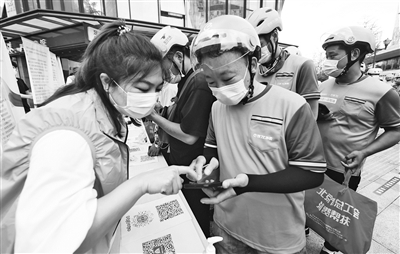 本报讯 (记者 赵思远)“不仅拿到了清凉大礼包,还了解了工会知识和福利,我已经迫不及待地要加入工会大家庭了!”在通州区万达广场商圈送餐的美团外卖骑手葛军说。8月20日,通州区北苑街道总工会在北苑街道西关社区的万达广场商圈开展了关爱新业态职工“送清凉”活动,市总工会赴基层蹲点的机关干部与通州区总工会、北苑街道总工会共同为外卖员、快递员等新业态劳动者普及工会知识,宣传工会职能,发放清凉包和调查问卷,并联合北京银行现场为他们办理工会会员互助服务卡。