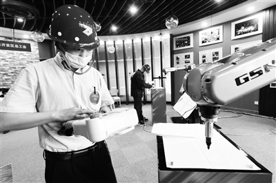 8月24日中午12时30分,第五组的两位选手全神贯注盯着操控板屏幕,进行着一系列操作,工业机器人在他们的指挥下时而按一定轨迹运动,时而在考纸上画图。按照比赛要求,工业机器人的轨迹描画误差要控制在1毫米。