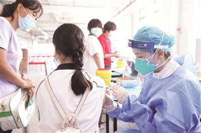 8月26日上午,丰台区南苑街道京粮悦谷家园疫苗接种点,12-17岁青少年人群接种疫苗有序进行。截至8月25日,丰台区教育系统所属初中、高中、职业高中已有29990名12-17岁的在校生接种过新冠疫苗,接种率达97.70%。