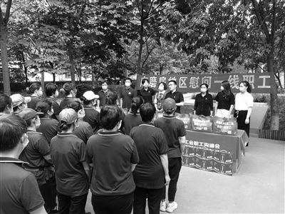 本报讯 (记者 刘欣欣) 近日,朝阳区南磨房地区总工会开展疫情防控一线职工慰问活动,并在慰问活动后,召开物业服务一线职工座谈会。市总工会基层蹲点工作组第二组成员全程参加此次活动。