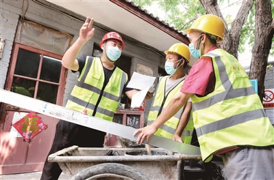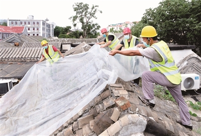 “师傅们,咱们再加把劲儿,争取上午就把这两间房处理好,下午还有新任务。”站在房顶上的任吉斌,边说边干,同大伙一块搬瓦递泥,铺苫雨布。