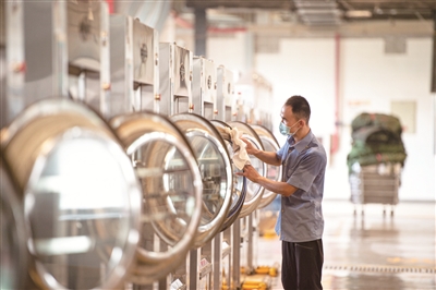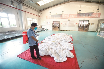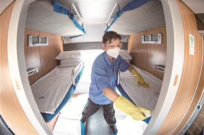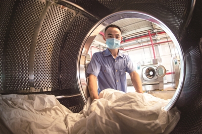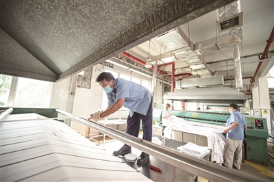 80分钟后,清洗完毕的卧具从滚筒洗衣机中取出,被送至专业熨烫机处进行熨烫和烘干,韩伟强还要对使用过的洗衣机进行全身的清洁和消毒。烘干后的卧具被工作人员叠好打包,在11点半前被送至即将出发的客运列车上,由保洁员铺设,以干净、整洁、崭新的面貌等待着下一波旅客的到来。