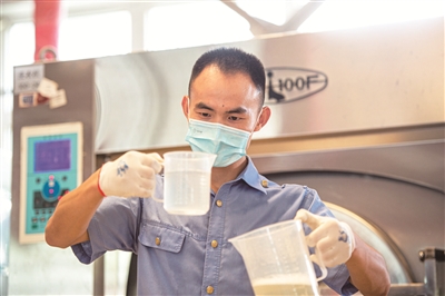 清晨八点,一列旅客使用过的火车卧具准时运达北京客运段洗涤车间。进入洗衣机前,工作人员要将它们分摊开来,进行统一的消杀和分拣工作。韩伟强是客运段的洗涤工,疫情的到来,使得他的工作内容发生了一系列的变化。“平时洗涤卧具使用30-40℃的水就够了,现在要用90℃高温的水洗涤。”为了防疫需要,卧具洗涤剂的配置一样要调整。在以往300毫升液体洗涤剂搭配200毫升消毒剂的基础上,韩伟强现在要同时加入次氯酸钠消毒剂,让卧具上的病菌无处可逃。