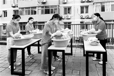 北京阳光北亚家政服务有限公司为避免人员聚集,近日将员工技能培训课搬到室外进行,同时要求每次上课的学员不得超过5人,以保障大家在安全的环境下学习家政服务的技术技能。万玉藻 摄影报道