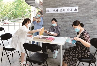 之前的职工书屋由于室内书屋面积不大,读者多时再加上工作人员,就显得有些挤了,疫情之下,这个问题就更突出了。怎么办呢?副站长田绍杰经过思考后与大家商量:“把书屋搬到室外怎么样?”“好!”所有人员几乎是同声叫好。说搬就搬,工作人员扮演“搬运工”,搬桌子、扛椅子、抱图书,把职工书屋从室内转到室外。田绍杰说,“得给这儿起个名儿啊。”魏群想了想说,“就叫职工书屋室外阅读角吧。”“好!就叫这个!”大家一致赞同。