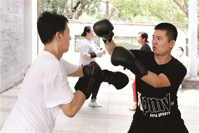 女职工王晓莉喜欢唱歌,最近又迷上了拳击。在拳击活动区,她一边做着准备活动,一边等待着另一个女拳友。40分钟过后,仍不见女拳友到场,心急的王晓莉竟然与一旁的男拳手“打”了起来。事后,职工们相聚,还有人拿此事开玩笑说,“晓莉是咱们龙潭街道唯一敢挑战男拳手的女拳王。”王晓莉听后非常开心,她说,“现在职工之家的很多活动转到室外,户外空气清新,真是太好了。”