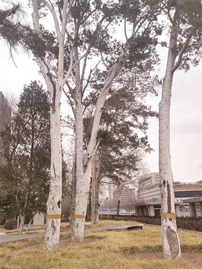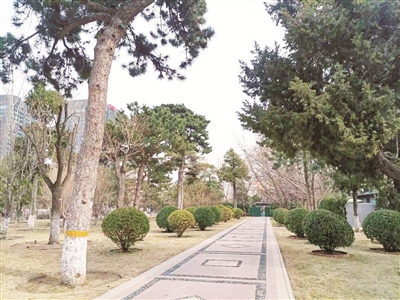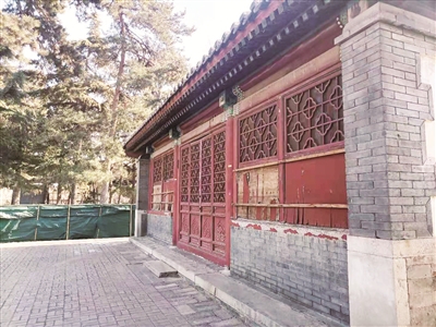 这座建筑的南面有两棵古槐,一左一右相对称,距此数十米外,有不少的古松柏,按照树上所悬挂的绿色标牌显示,这些古树的树龄多在200年以上。