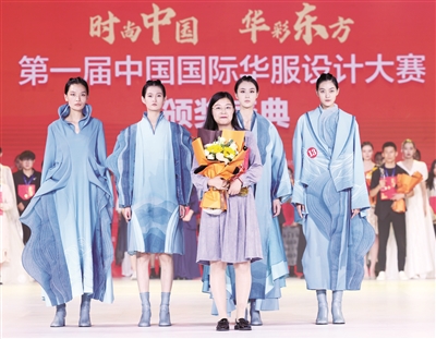9月25日,获得金奖的北京服装学院研究生常青(前中)和身着获得金奖作品的模特在颁奖仪式上。当日,第一届中国国际华服设计大赛在山东省济南市举行。此次大赛收到来自全球1200多件作品参赛,在最终闯入决赛的27件作品中,来自北京服装学院的研究生常青凭借作品《行于山水之间》获得金奖。