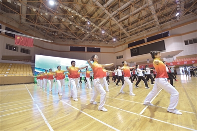 9月27日,恰逢北京2022年冬奥会开幕倒计时130天,地坛体育馆再次响起了第九套广播体操的音乐。在充满活力的旋律中,北京市第三届第九套广播体操展示大赛正式拉开帷幕,来自全市各街道乡镇、机关和企事业单位的40支代表队,共600余人参与其中。本报记者 彭程 摄影报道
