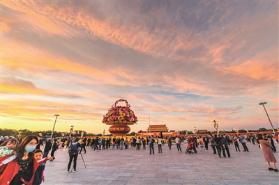 10月10日傍晚,京城再度出现火红的晚霞。未来两天北京地区以晴为主,利于出行。但由于夜间气温较低,早出晚归要及时添衣保暖。图为在天安门广场拍摄的绚丽晚霞。