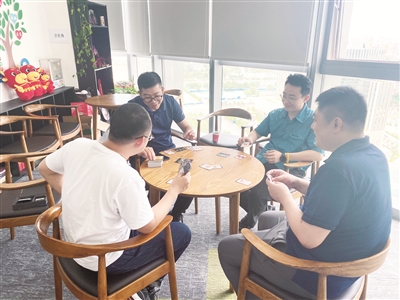 “像我就经常参加工会组织的棋牌活动,每次在繁忙的工作之余玩一会儿,特别解压。”丽泽管委会党群工作科科长罗鑫说。在严格执行疫情防控措施的前提下,丽泽管委会工会积极组织开展多种活动,丰富职工业余生活。利用业余时间组织开展棋牌活动,职工们可自行组队参与竞赛;制定《丽泽管委工会工间操管理制度》,动员全体职工踊跃参与工间操活动;组织全体职工开展“观绿心、践初心、强信心”健步走活动。丰富的活动使职工们以更加健康向上、充满活力的精神面貌投身到繁忙的工作当中。