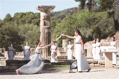 10月18日,扮演最高女祭司的演员乔治乌(右)取得圣火。当日,北京冬奥会火种在奥林匹克运动的发祥地——希腊伯罗奔尼撒半岛的古奥林匹亚采集成功。在有着两千多年历史的赫拉神庙遗址前,奥运火种再次为北京点燃。新华社发