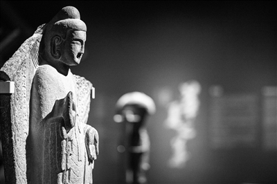 中华民族自古以来就有多个民族互相影响互相融合的趋向,而在一千多年前的山西大同,由鲜卑族建立的政权更是直接掀起了民族大融合的高潮。这一时期的本土思想和文化艺术与异域文化发生了激烈碰撞,不仅留下了极具特色的时代印记,还促进了中国社会的发展。虽然时代不断改变,这种文化交融的状态却一直在山西留存。尤其是在魏朝,佛教艺术逐渐从南亚次大陆东传,并在中国本土形成了闪耀夺目的新面貌。北魏时期开凿的大同云冈石窟造就了5世纪中国石刻艺术的巅峰。从北魏到隋唐乃至宋辽金,山西大地上的佛造像水准高超,风格显著,此次展览上的若干尊,更是庄重慈悲,有着语言无法描述的大美。其中有一尊北齐石雕菩萨头像,在柔光中散发着淡淡的光辉,让人久久不忍离去。在展区内还有一座阿难立像,展现了从北魏到唐代佛像造型演变的过程。两边对称的正面结构被打破,“石头”的坚硬和僵直被柔和的圆柱形大轮廓取代,造像的衣饰更加贴身,显出肌体的韵律,形成了“曹衣出水”“吴带当风”的艺术风格。这一风格,对后世的中国人物画有着极深刻的影响。