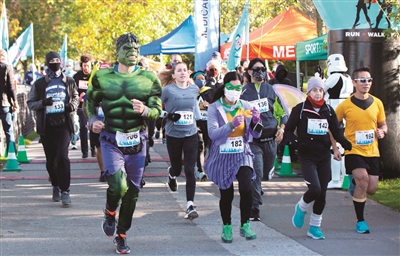 10月24日,加拿大多伦多举行2021年“变装”5公里长跑,吸引了数百名身着各式动漫服装的参赛者。图为穿着动漫服装的人们在加拿大多伦多参加“变装”5公里长跑。