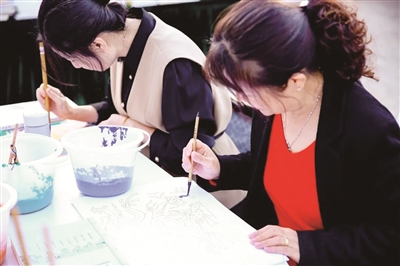 起谱子、扎谱子、拍谱子、沥粉、刷色、贴金……来自故宫油漆彩画及裱糊作专家将课堂“搬”到现场,带领“工匠营”彩绘专业学员展示金龙天花彩画的制作技艺,吸引观摩人员纷纷上手体验。