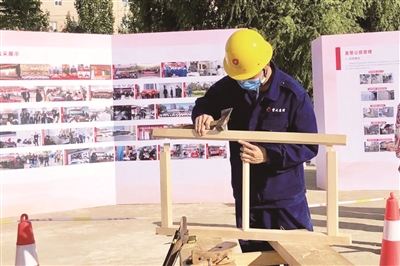 来自东四房屋管理有限公司维修管段职工王帅报名参加的是木工比赛。他将方尺、锯、刨子、斧子等工具摆成一排,先用刨子将木材刨平,然后用锯子锯断,再画线、凿榫、开榫,最后组装。他时而弯腰操作,时而起身观察,最终制作出了一个平整、方正的窗扇。“我学过几年木工,但是操作不太熟练。去年,京诚集团开设了‘工匠营’实操培训课程,我和其他学员跟着老师傅线下实操了7次,从传统木工工具使用到燕尾榫、门窗的制作,收获非常大。”王帅说。他平时负责居民房屋的小修小补,木工技术不可或缺,“比如木质柱子下端腐朽需要墩接,锯木头、制作巴掌榫等木工技能都用得上。”