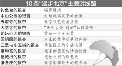 据介绍,本次推出的10条“漫步北京——赏银杏品文化主题游线路”,涵盖了北京深秋赏银杏最具代表性的地方,比如钓鱼台国宾馆东门外、中山公园、圆明园、五塔寺、大觉寺、地坛公园、三里屯使馆区、皇城根遗址公园等地。市民及游客可漫步其中,欣赏阳光下银杏叶绝美的金黄,感受北京秋季落叶的韵味,同时推荐了附近的网红打卡地,市民可前往探寻北京时尚新地标。