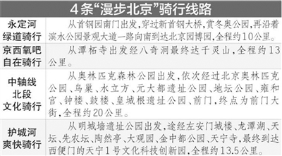 与此同时,北京市文化和旅游局还结合慢行系统,推出了4条漫步北京秋季骑行线路,号召更多市民朋友加入绿色出行的队伍,身体力行参与到减少污染,降低碳排放中来。骑行线路既包括沿途的皇城古建,也包括郊区的深山寺庙。沿着二环护城河畔沿线的自行车道慢行交通系统,慢慢品味北京城区的秋色,不经意间便有了“不似春光,胜似春光,寥廓江天万里霜”的感觉。
