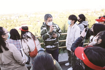 在通过地图对北京中轴线有了基本了解后,杨征带着同学们走到永定门城楼下,介绍永定门的拆毁、复建、意义等。接着又来到前门大街,让同学们了解老北京的民俗风情。登顶景山公园最高峰后,同学们俯看故宫全景,听杨征详细讲解故宫建设规划的小知识和景山的历史。在行程的最后一站钟鼓楼前,同学们仰望鸟群从鼓楼上方飞过,感受着钟楼作为中轴线上最高建筑的巍峨。