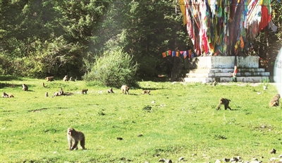 一个弯道开过来,眼前出现了一大片绿茵茵的草地,草地上开满了黄色的小花。一个高高的台基上插满了五颜六色的经幡,几十只猴子在草地上快乐地玩耍,这么美妙的景色让我觉得好像开车到了孙悟空的花果山。