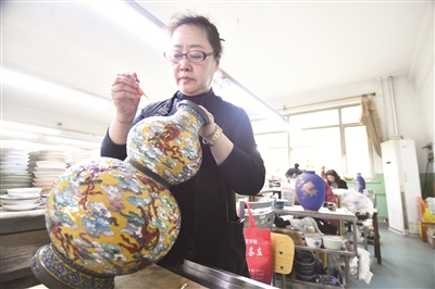 为了保证制作水平,李静会总体把握色彩调配,紧盯色图样品,反复跟工人师傅讲解制作上细微的差异给作品带来的影响,尽量使每一件作品与设计最为接近。她熟练掌握了点蓝工序的全套技艺,在景泰蓝色彩的运用和把握上形成了自己独到的见解和实践能力。