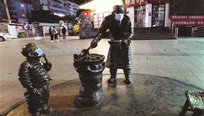 近日,有人给兰州市地标雕塑“热冬果”戴上了口罩,“老爷子站在街头卖冬果梨”。一锅热腾腾的冬果梨、一个慈祥老者、一个纯真的小男孩、一把铜铸的“空凳”,将“老兰州”的故事诉说给南来北往的人。疫情当下,以往繁华的十字街头,有些空荡,有人开始怀念堵车的日子……有人让这老幼戴上了口罩,夜幕下,显得那样温情。
