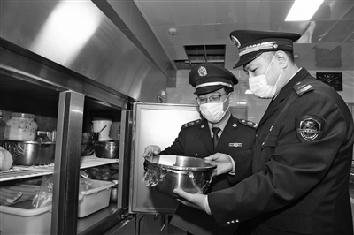 近日,通州区市场监管局开展养老助餐机构食品安全专项检查。在通州区光荣院,执法人员仔细查验食品原料库房每一类食品采购进货台账,一一核对食品标签上的生产日期与保质期,强调要严格执行食品加工制作操作规范,确保食品的采购、贮存、加工各环节按要求进行。本报记者 赵思远 通讯员 潘若莼 摄影报道