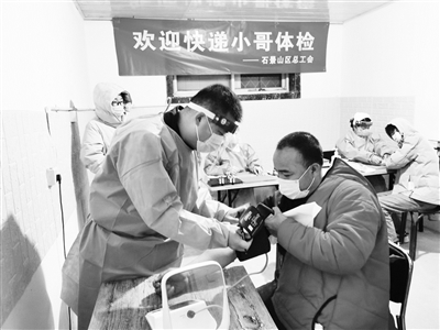 据了解,为统筹做好快递小哥的体检工作,根据快递业的分布按点分片,石景山区总工会将分几次送体检上门,此举受到快递点负责人的欢迎。