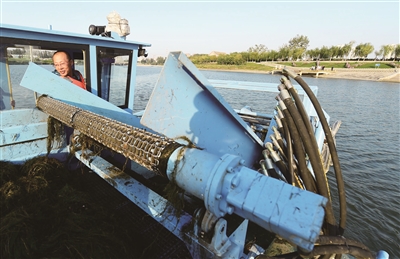 水草疯长也是大运河的一大烦恼。“水草过多,会在河面形成大面积漂浮,对河面美观及河道水质造成很大影响。”工作人员介绍。每年水草泛滥时都需要对其进行清理。处理水草的主要方式分为化学清除法和物理收割法两种,其中,化学清除法会引起水质污染与恶化,破坏水域的生态环境,而人工割草又效率不高,且很累人。经反复试验,北运河管理处的工作人员自主研发出了一种小型新能源割草船,所有的切割都是电控的,切割时噪声低,无污染又环保。“下刀最多可以下到水面以下50厘米。最高峰的时候我们一天能割120方水草,折合成重量有40多吨。”工作人员介绍,研发的新能源割草船较传统的清理方式提高效率10余倍。这一“割草神器”还获得了4项专利。