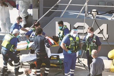 11月24日,在马耳他森格莱阿,医疗人员救助一名非法移民。马耳他武装部队24日发表声明说,马耳他武装部队当天在该国海域救起43名非法移民。声明说,这批非法移民获救时大部分健康状态不佳,马耳他方面及时给予了医疗救助。他们中有12名妇女和两名儿童,一名妇女在获救不久后死亡。