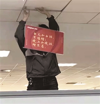 山东某集团办公室内多处挂上了花式加班语:“有空就去‘加班’吧,去完成那些我们还未完成的事!”“白天加白班,不瞌睡;晚上加晚班,睡不着。”“大家加,才是真的加,加班真好。”“他加我也加,想跑也跑不了。”
