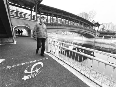 记者在金中都公园南护城河沿岸看到,来此散步的居民非常多。沿岸步道上,“北京西城区健走步道”标识清晰,踩下去,摩擦力、回弹感十分舒适。