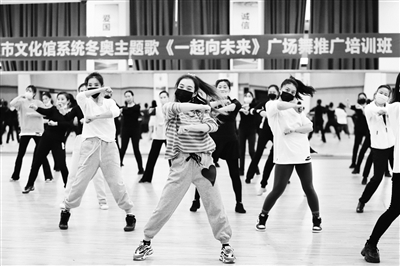 近日,冬奥主题曲《一起向未来》的旋律在西城区文化馆最大的舞蹈教室内一遍遍唱响。80名来自全市各文化馆的舞蹈业务干部和舞蹈文化志愿者正在集体学习崭新编创出炉的《一起向未来》广场舞。