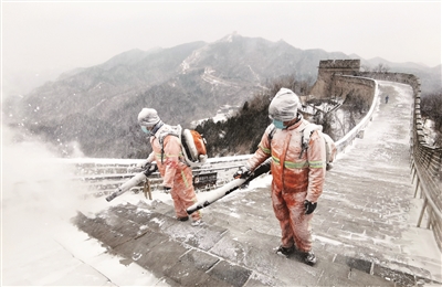 12月9日清晨,一场降雪让八达岭长城银装素裹,美景如画,白雪掩盖了登城步道。清晨5点30分,身着橘红色工作服的景区保洁员们到岗,赶在7点30分开园前,为游客清理出安全通道,成为寒冷冬日里一道亮丽风景。截至中午,经过近7小时的连续奋战,景区积雪基本清理完。据了解,多年来,八达岭景区加强文物保护,城上除雪全部采用人工清理的方式,坚决杜绝因投放融雪剂对墙体造成腐蚀破坏,确保游客人身和文物安全。