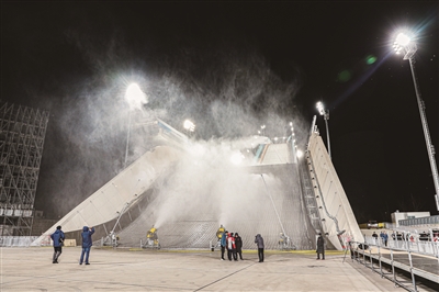 昨天凌晨,首钢滑雪大跳台正式开始造雪,标志着场馆电力供应达到赛时标准。首钢滑雪大跳台又称“雪飞天”,位于石景山新首钢园区内,是北京2022年冬奥会北京赛区唯一一个雪上竞赛场馆,将在赛时承担自由式滑雪大跳台和单板滑雪大跳台两个比赛项目。赛后,这里还将成为世界首个永久性保留和使用的滑雪大跳台场馆,面向公众开放。