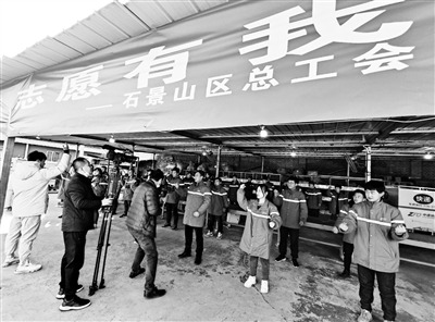 本报讯 (记者 张晶) 日前,石景山区总工会带领美团外卖、中通快递的小哥们,参与拍摄冬奥主题曲《一起向未来》MV,用镜头记录下了快递小哥们参与冬奥、助力冬奥的喜悦心情。