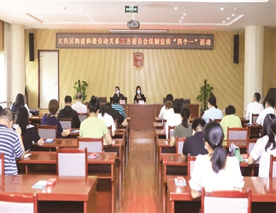 培育助推和谐劳动关系企业共同行动工作,是今年市、区三方的一项重点工作,大兴区三方委员会成员单位、各镇、街道、产业基地高度重视。为推进培育助推工作,大兴区总工会建立了“四个一”服务企业工作机制,精准施策,稳步助推。即:“出具一份体检报告,开展一次问题分析,举办一次政策培训,完善一套规章制度”。